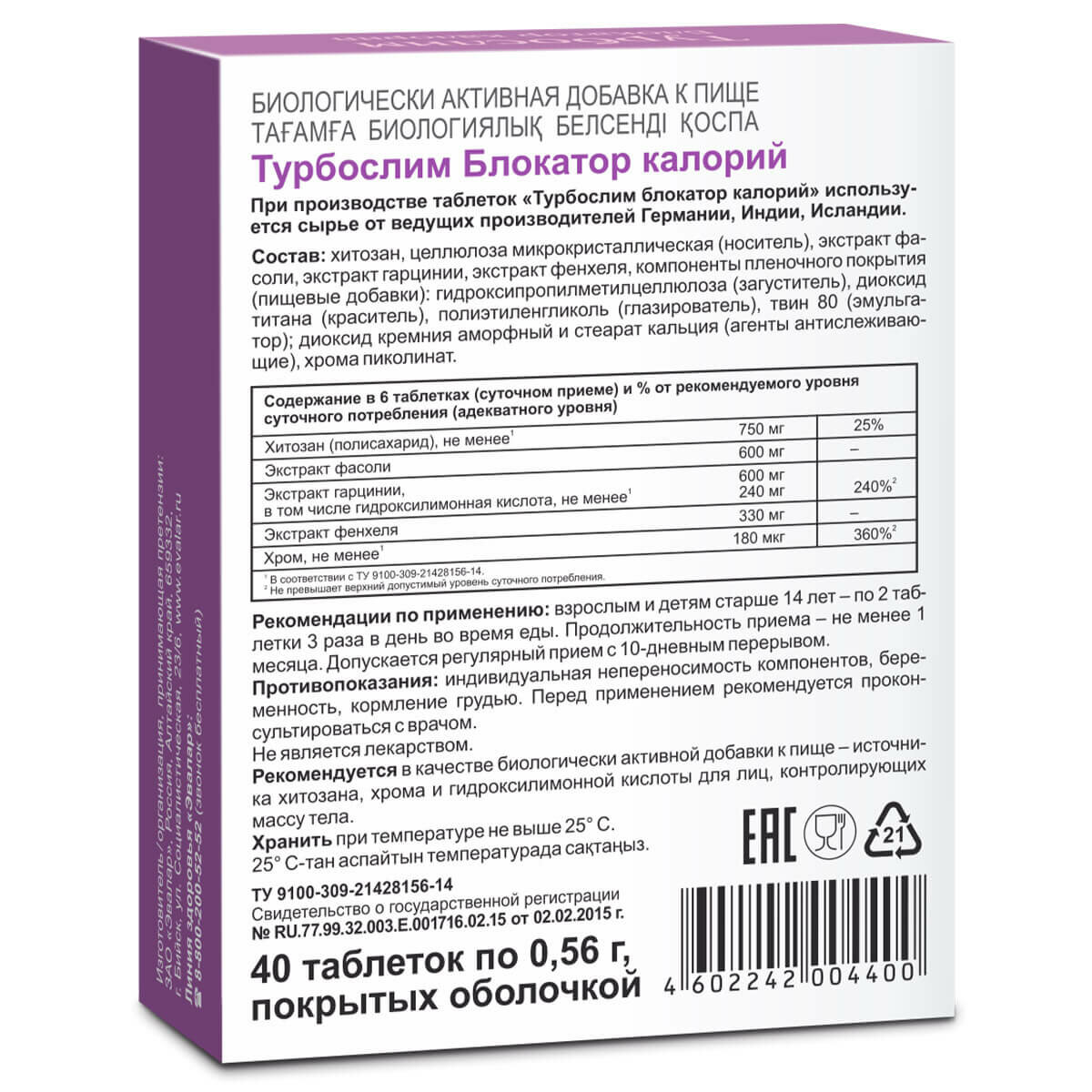 Турбослим Блокатор калорий, 40 таблеток, Эвалар интересное:
