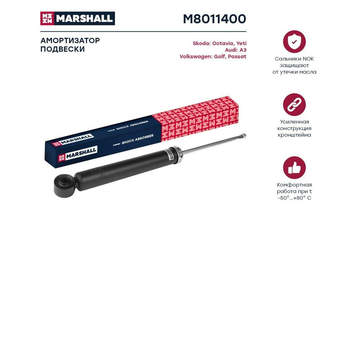 Амортизатор газонаполненный задний MARSHALL M8011400 для VAG A3 03-/Altea 04-/Octavia II 04-/Yeti 09-/Golf V,VI 03-/Passat VI,VII 05- (344459 // 1K0512011PE, 1K0513029BS, 1K0513029CA)