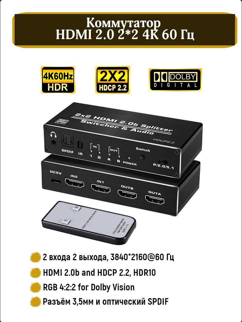 Коммутатор 2x2 (Splitter-switch) HDMI 2.0 4K 60 Гц HDR c аудио интересное: