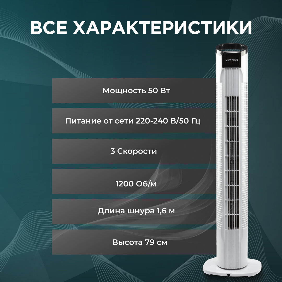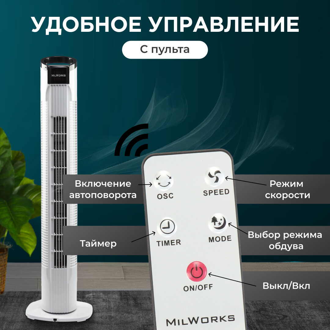 Вентилятор напольный MilWorks с пультом управления, таймером и сенсорной панелью. 79см. 3 режима скорости, 50ВТ. Белый интересное: