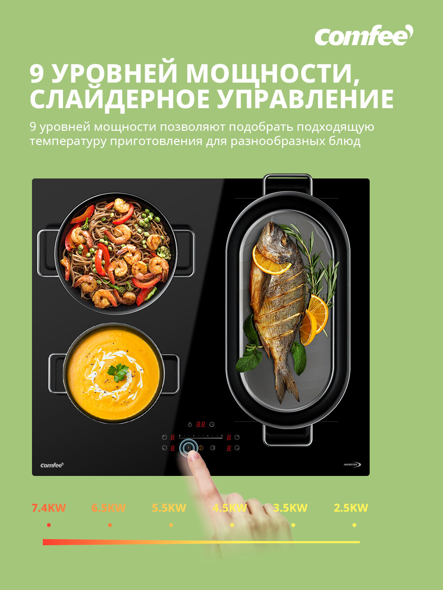 Индукционная варочная панель Comfee CIH611, инвертор, ширина 60 см, единая зона нагрева Flex, сенсорное управление слайдер, 9 уровней мощности, Boost, таймер, блокировка, автообнаружение посуды, черный интересное: