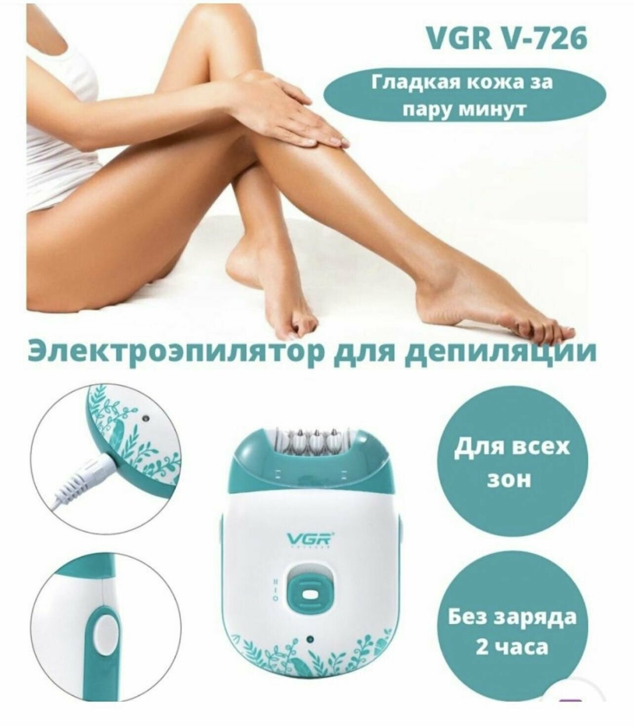 | Подробная комплектация | Эпилятор VGR V-726; Защитный колпачок; USB-кабель; Щеточка для очистки. |