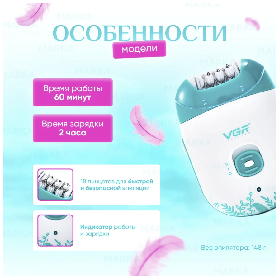 Эпилятор водонепроницаемый VGR V-703, белый, голубой, 1 шт.