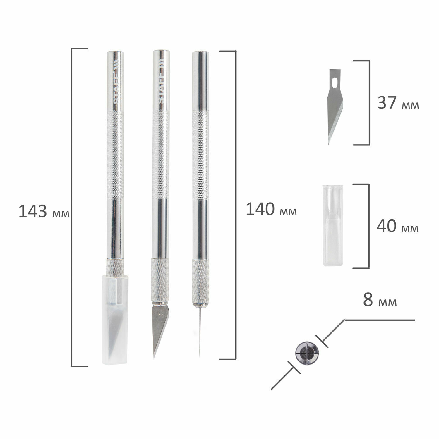 Канцелярский нож 8мм скальпель макетный, комплект 6 лезвий, металлический корпус, Staff, 238258