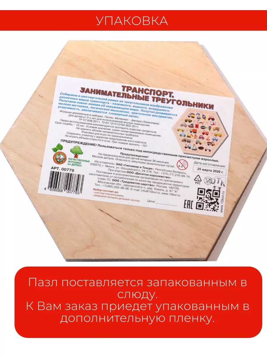 Деревянный пазл-головоломка для малышей "Транспорт. Занимательные треугольники", 24 треугольных вкладыша интересное: