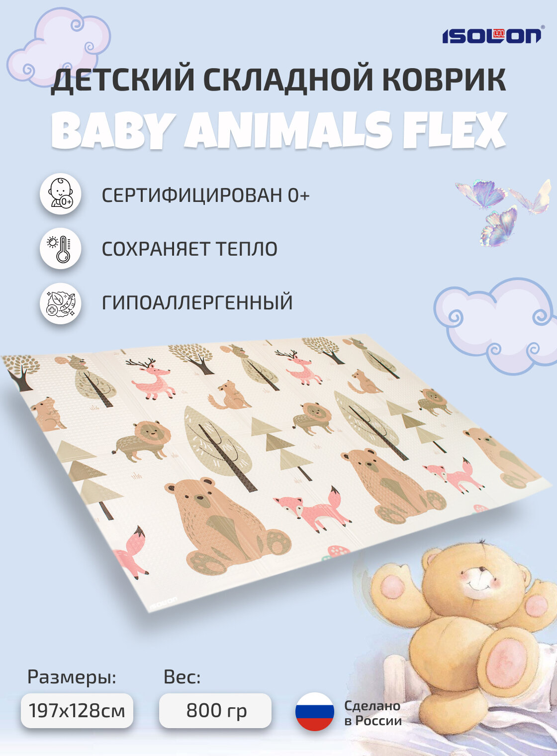 Детский массажный коврик для ползания "Зверята" складной ISOLON 15 мм