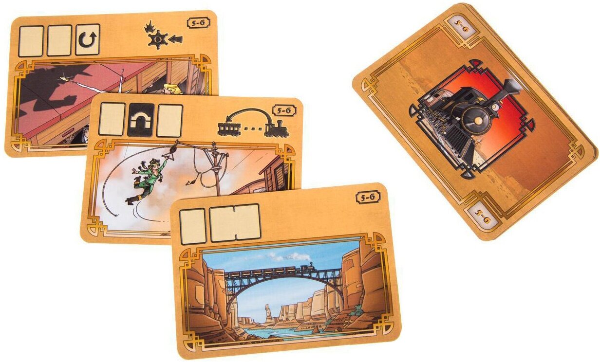 | Комплектация | набор элементов для сборки шести вагонов, локомотива и декораций, 7 деревянных фигурок, изображающих бандитов и шерифа, колода карт, жетоны добычи, правила игры |
