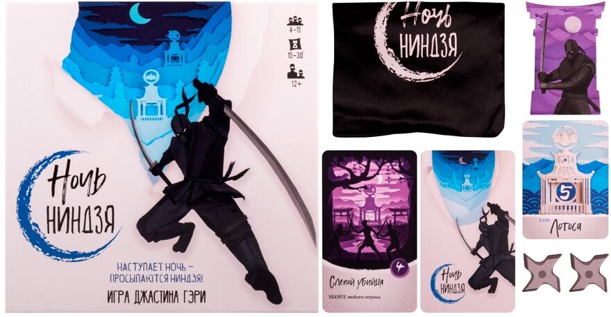 | Комплектация | 33 карты ниндзя, 11 карт кланов, 35 жетонов чести, 11 памяток, 11 подставок под памятки, мешочек для жетонов, правила |