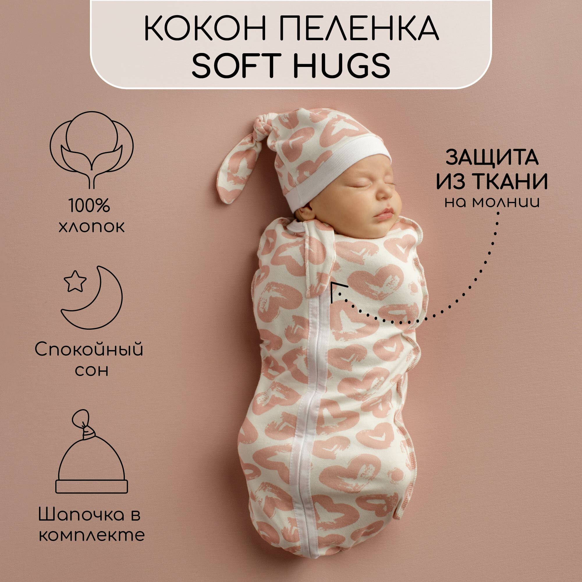 Пеленка (кокон на молнии) с шапочкой Amarobaby (Soft Hugs) 68/74 Сердечки