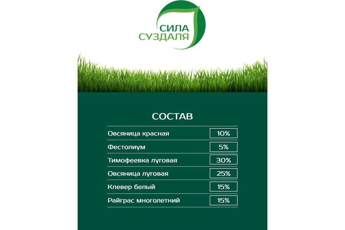 | Состав смеси | овсяница красная 10%, тимофеевка луговая 30%, райграс многолетний 15%, фестулолиум 5%, овсяница луговая 25%, клевер белый 15% |