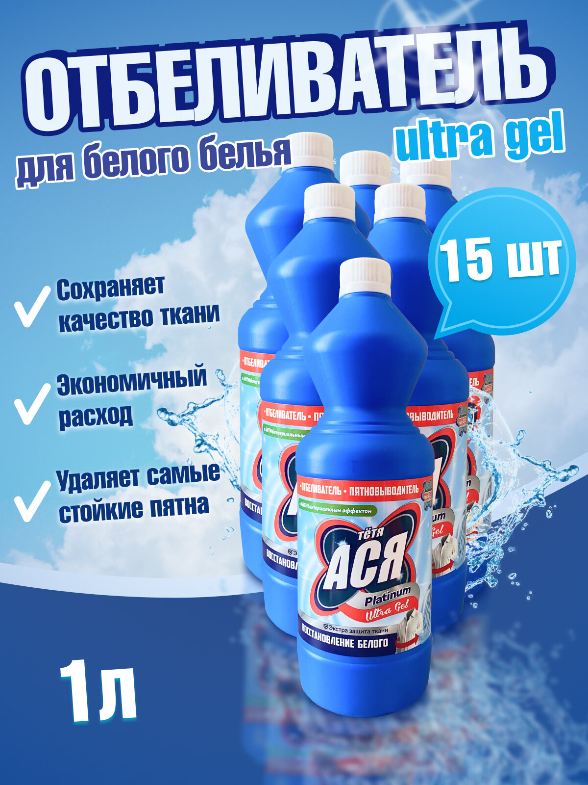 Купить Отбеливатель тетя Ася Platinum Ultra, гель 1 л для белого белья, пятновыводитель 15 шт.