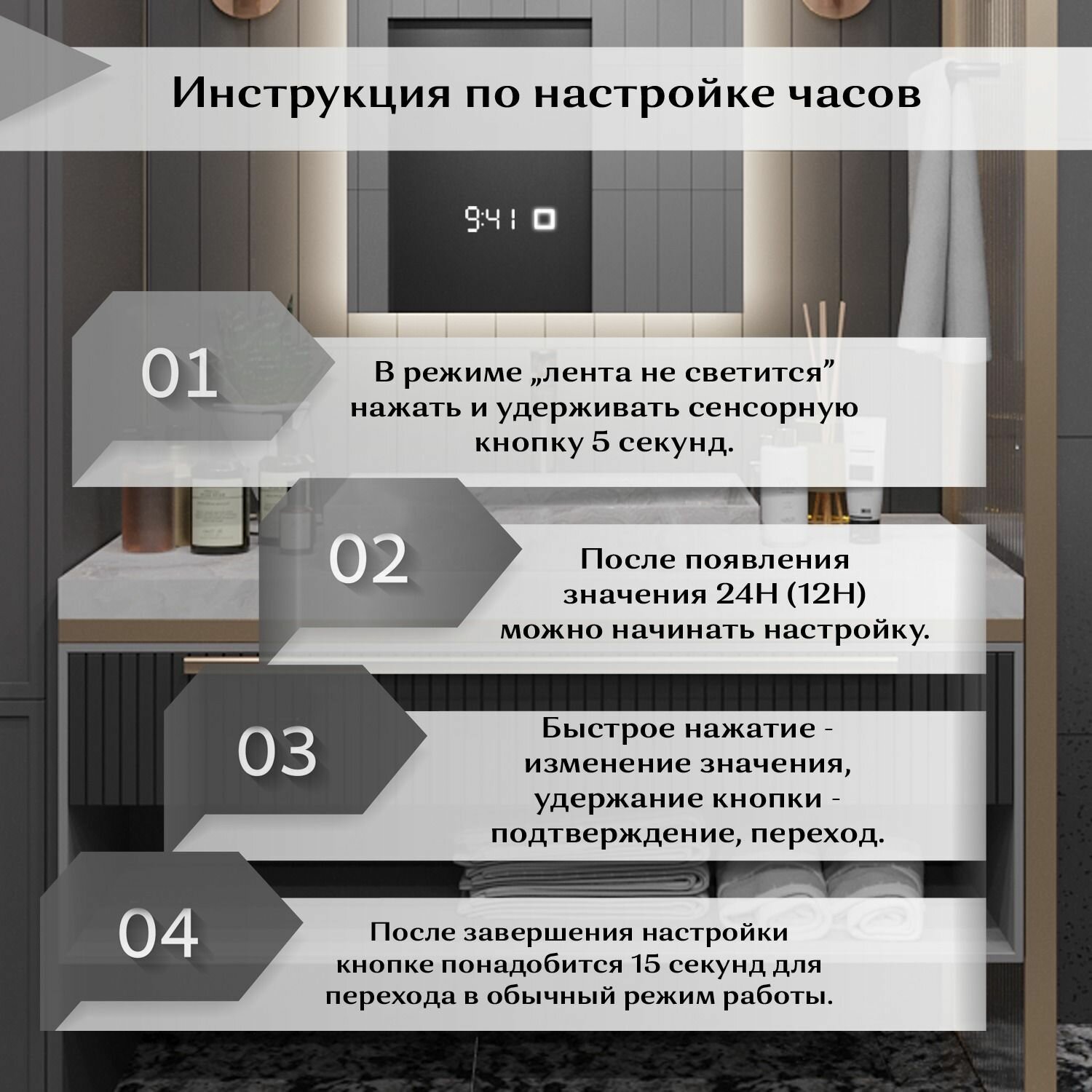 Зеркало в ванную с подсветкой настенное Alias Муза D110 с тёплой LED-подсветкой и часами, сенсорная кнопка