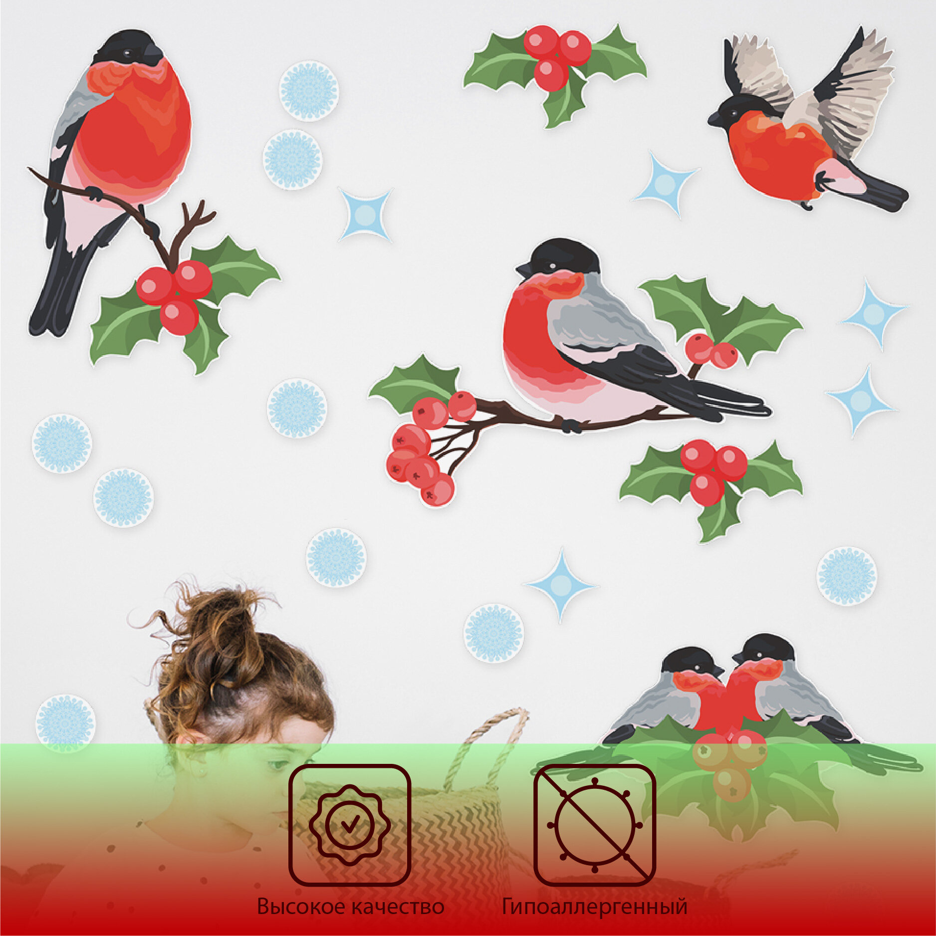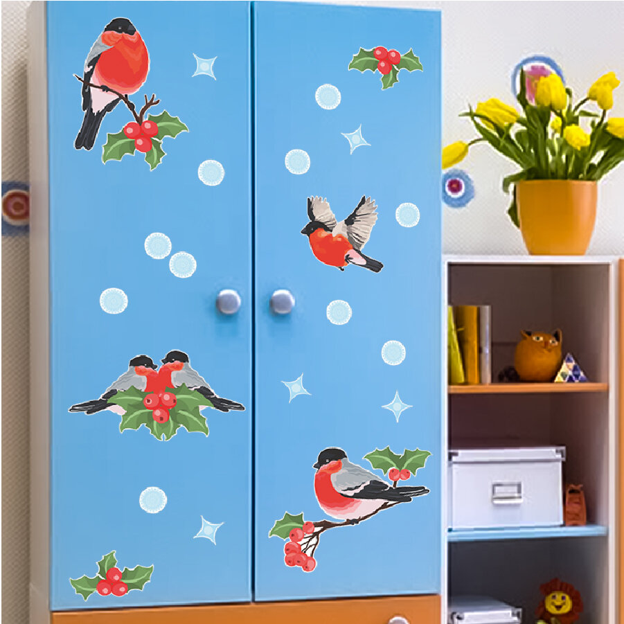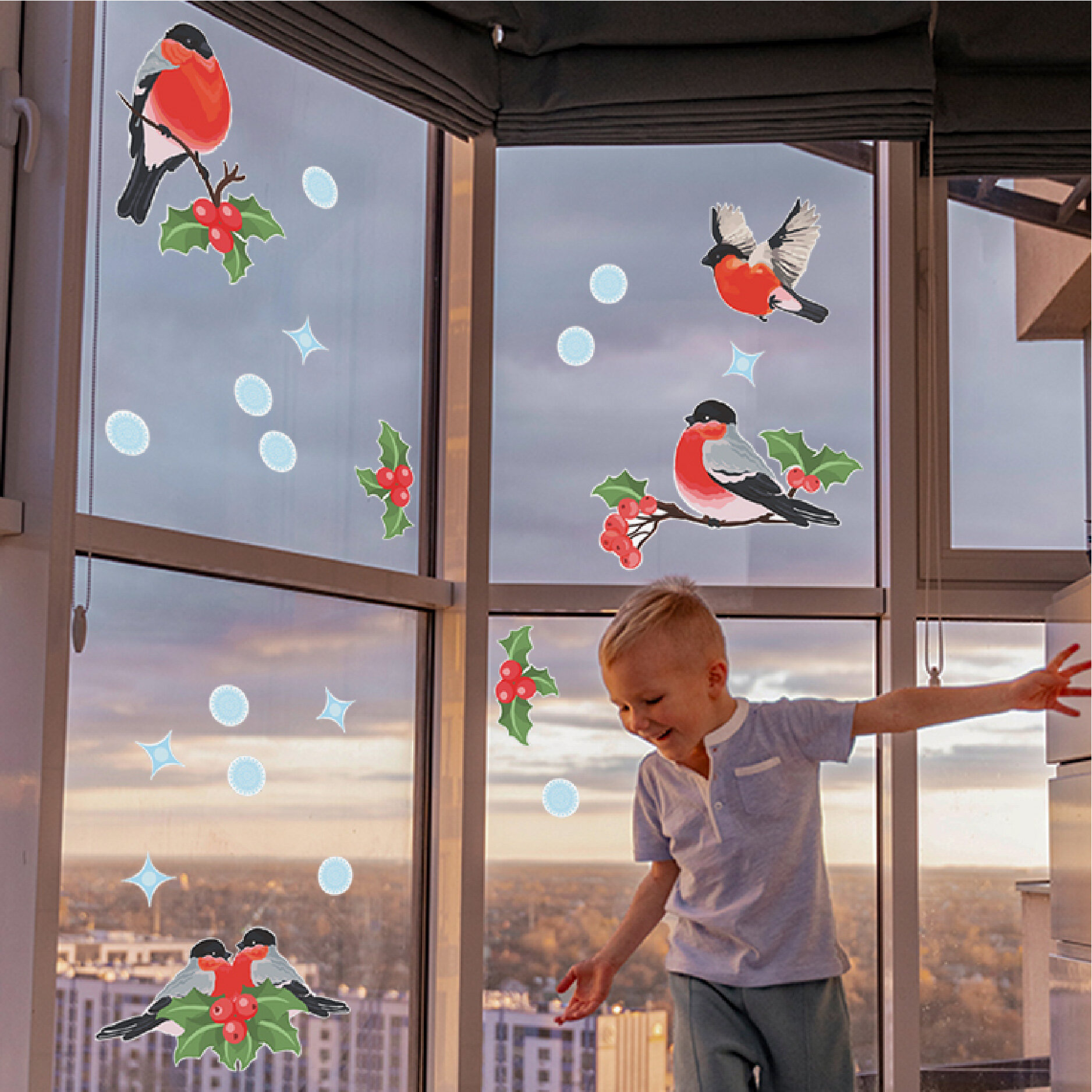 Новогодняя наклейка на окно / дверь / стену / мебель снегири и снежинки