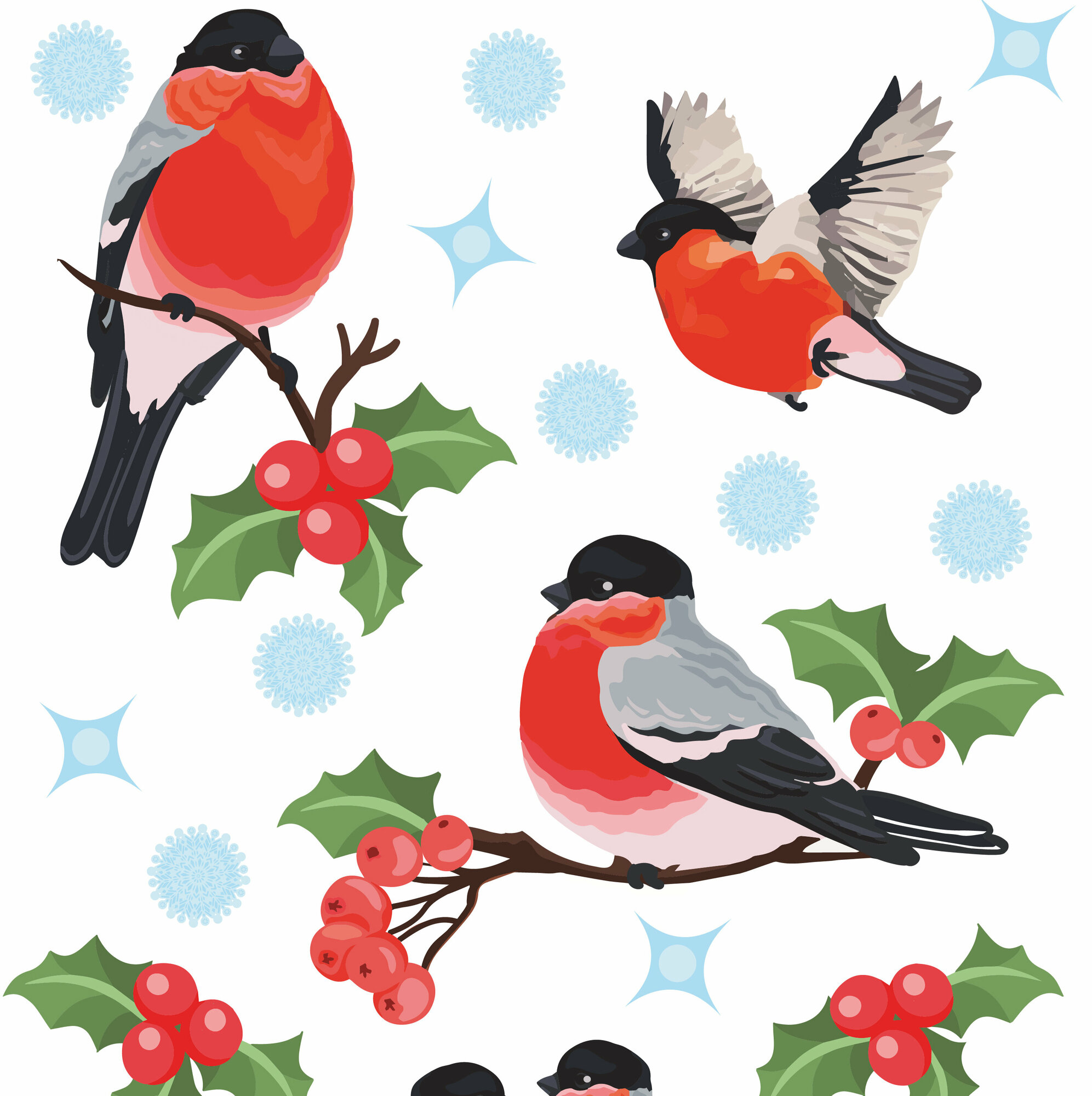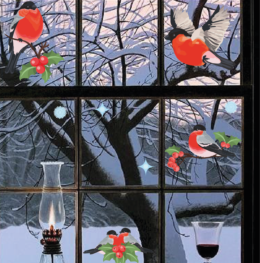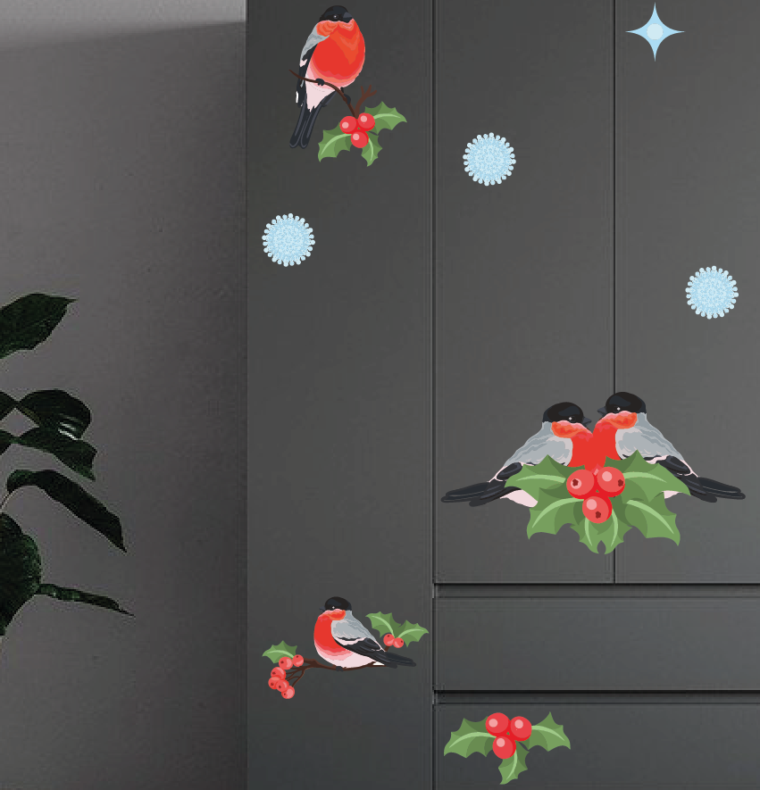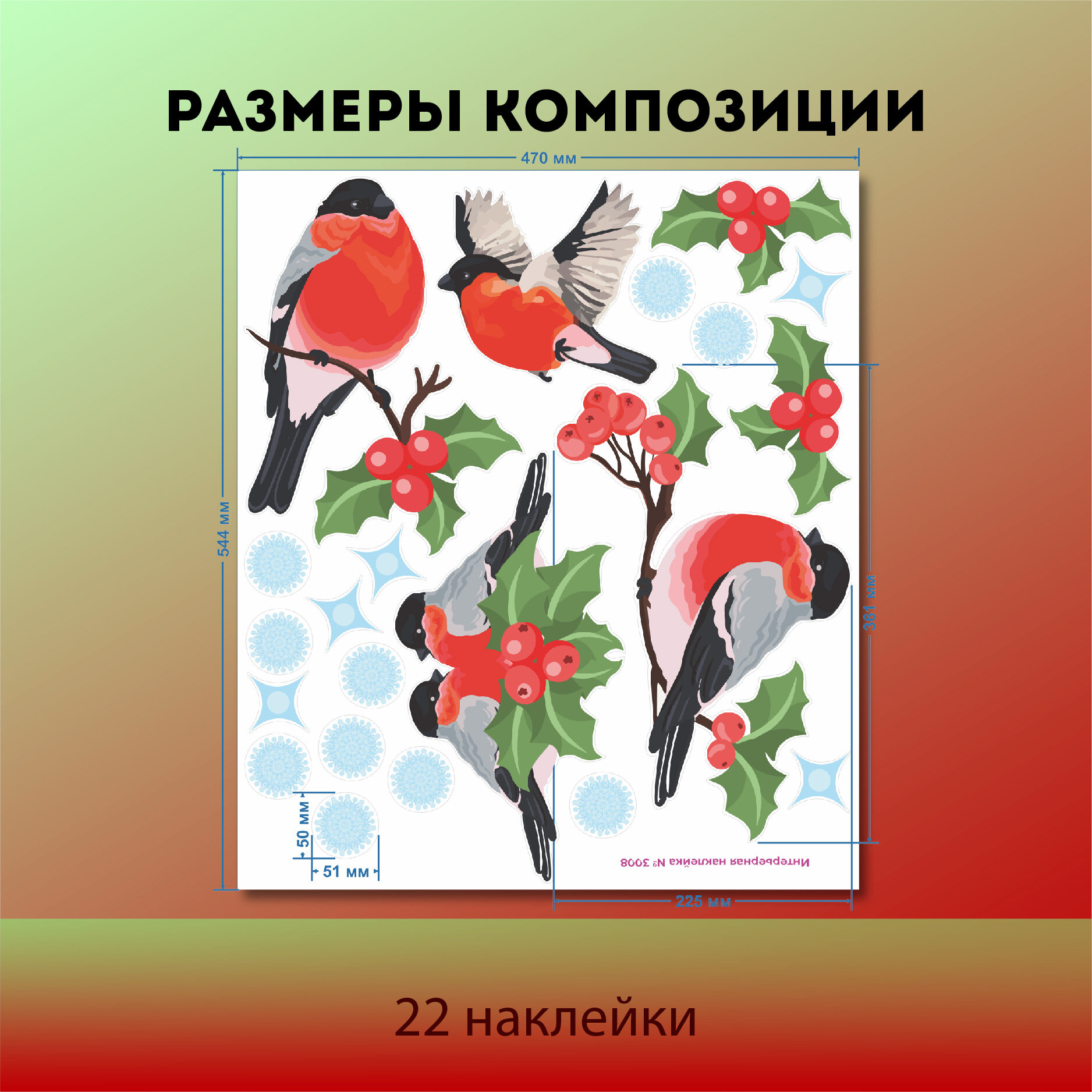 Новогодняя наклейка на окно / дверь / стену / мебель снегири и снежинки