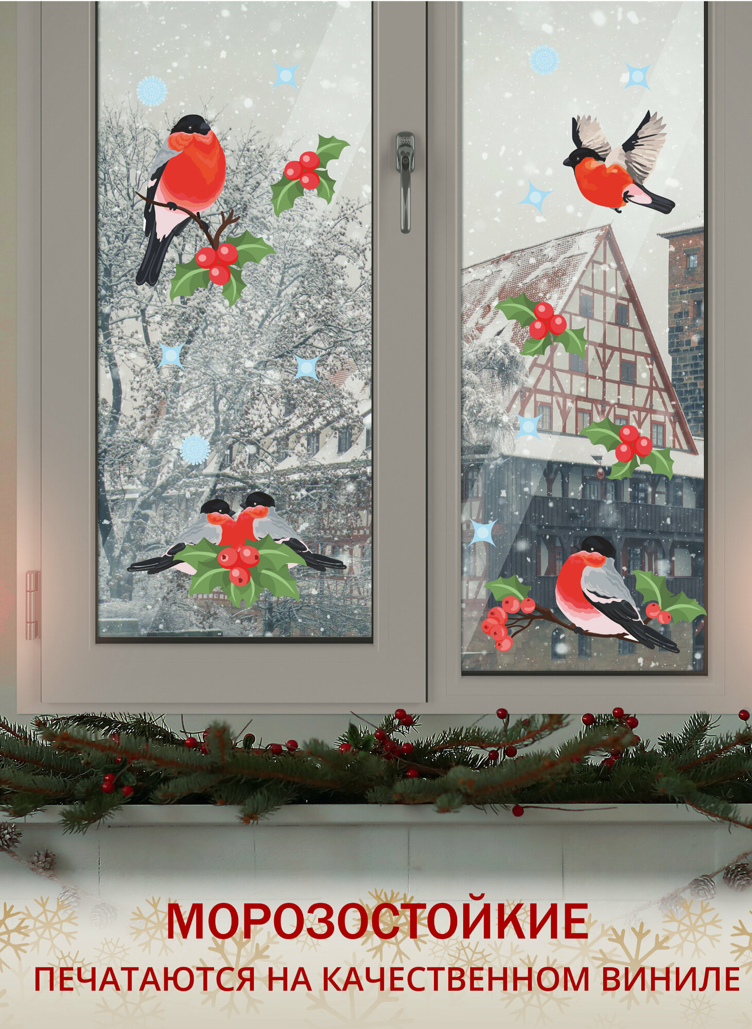 Купить Новогодняя интерьерная наклейка на окно/дверь/стену/мебель снегири и снежинки