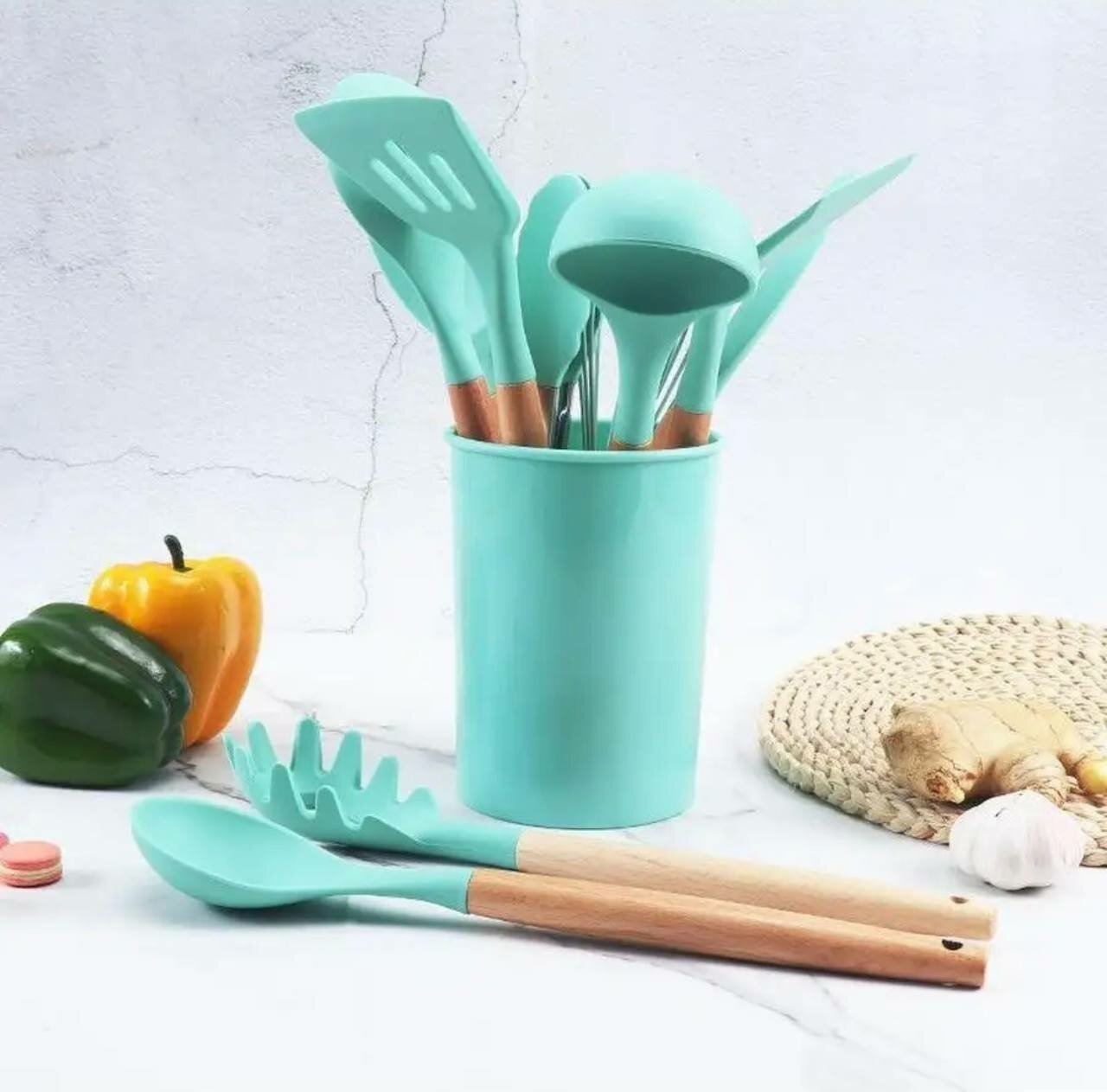| Состав набора | венчик / вилка поварская / кисть кулинарная / ложка для мороженого / ложка для соуса / ложка для спагетти / ложка поварская / ложка-дуршлаг / лопатка / лопатка для блинов / половник / шумовка / щипцы |