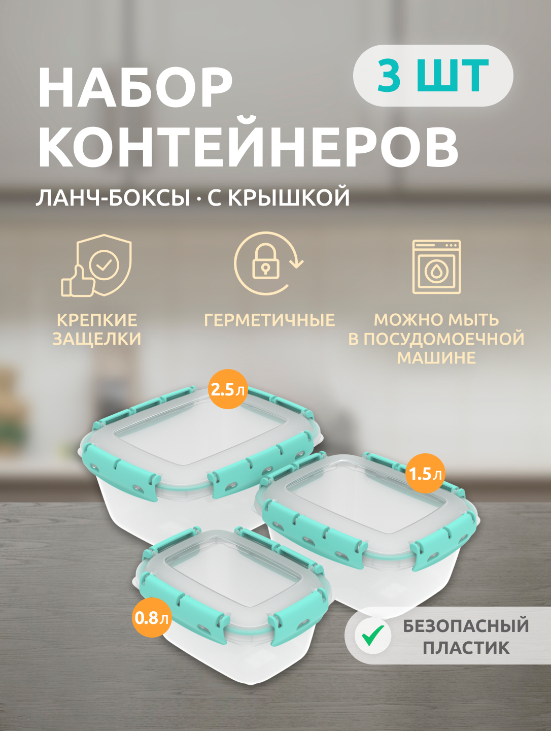 Купить Набор герметичных пищевых контейнеров с крышкой 3 шт: 0.8 л, 1.5 л, 2.5 л, АП 719