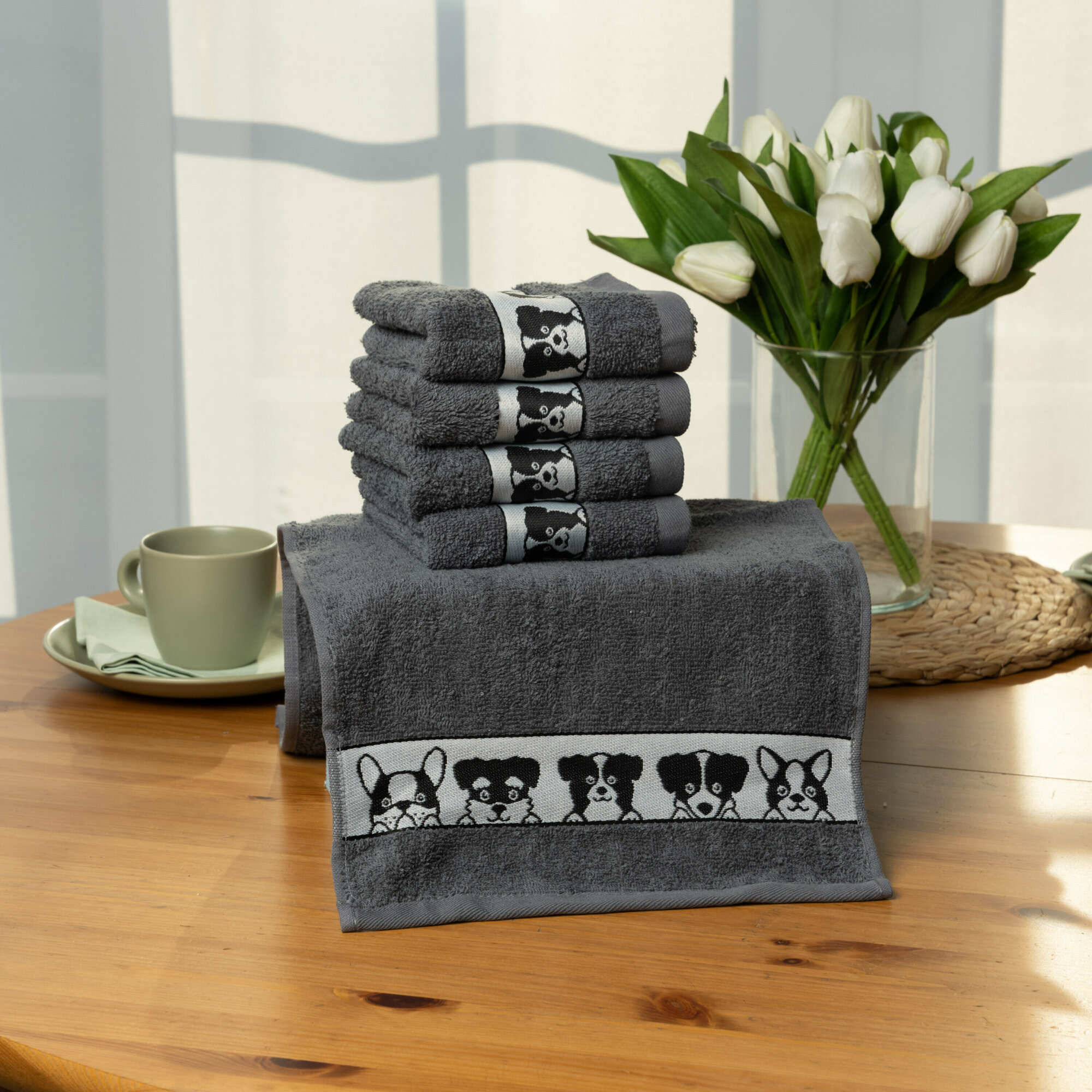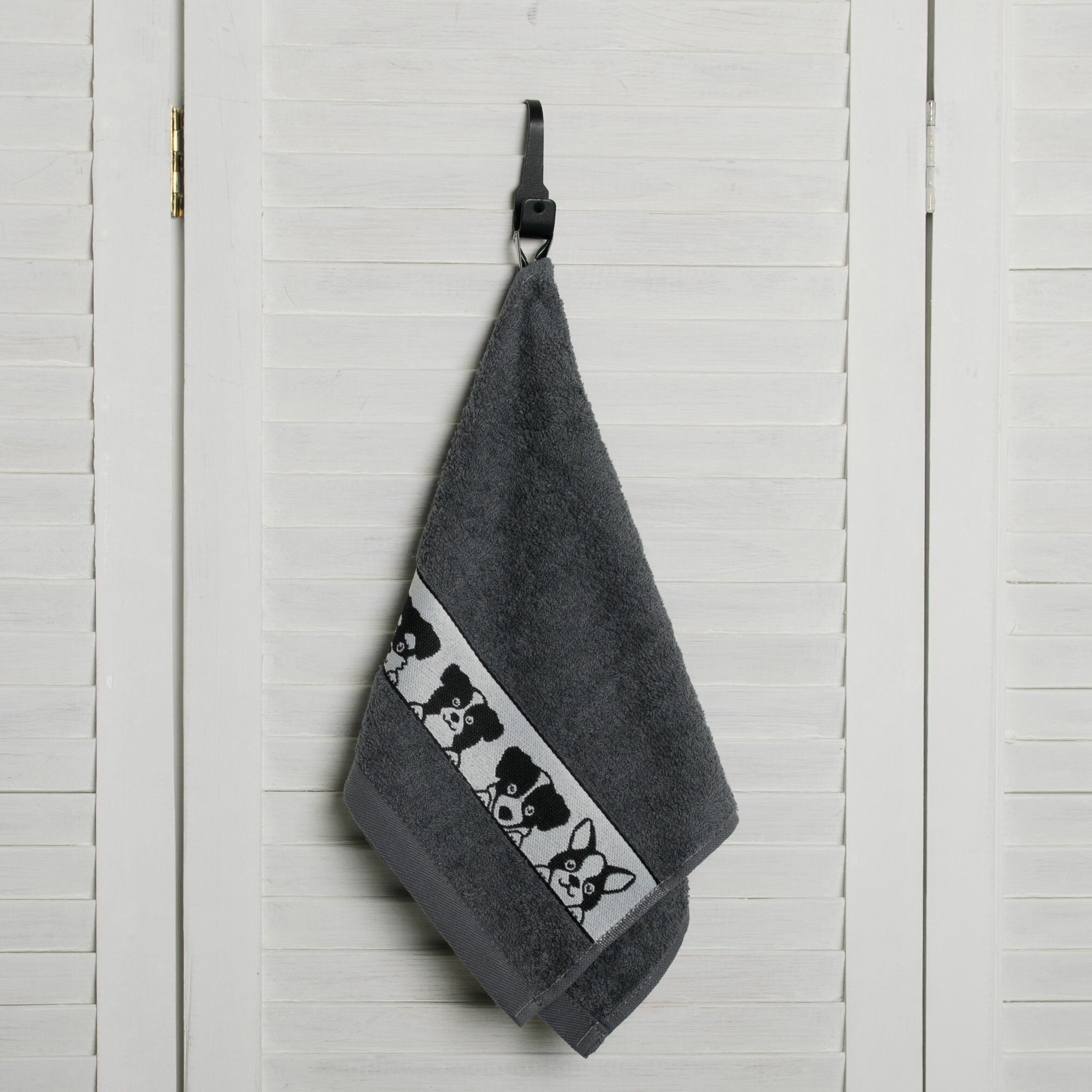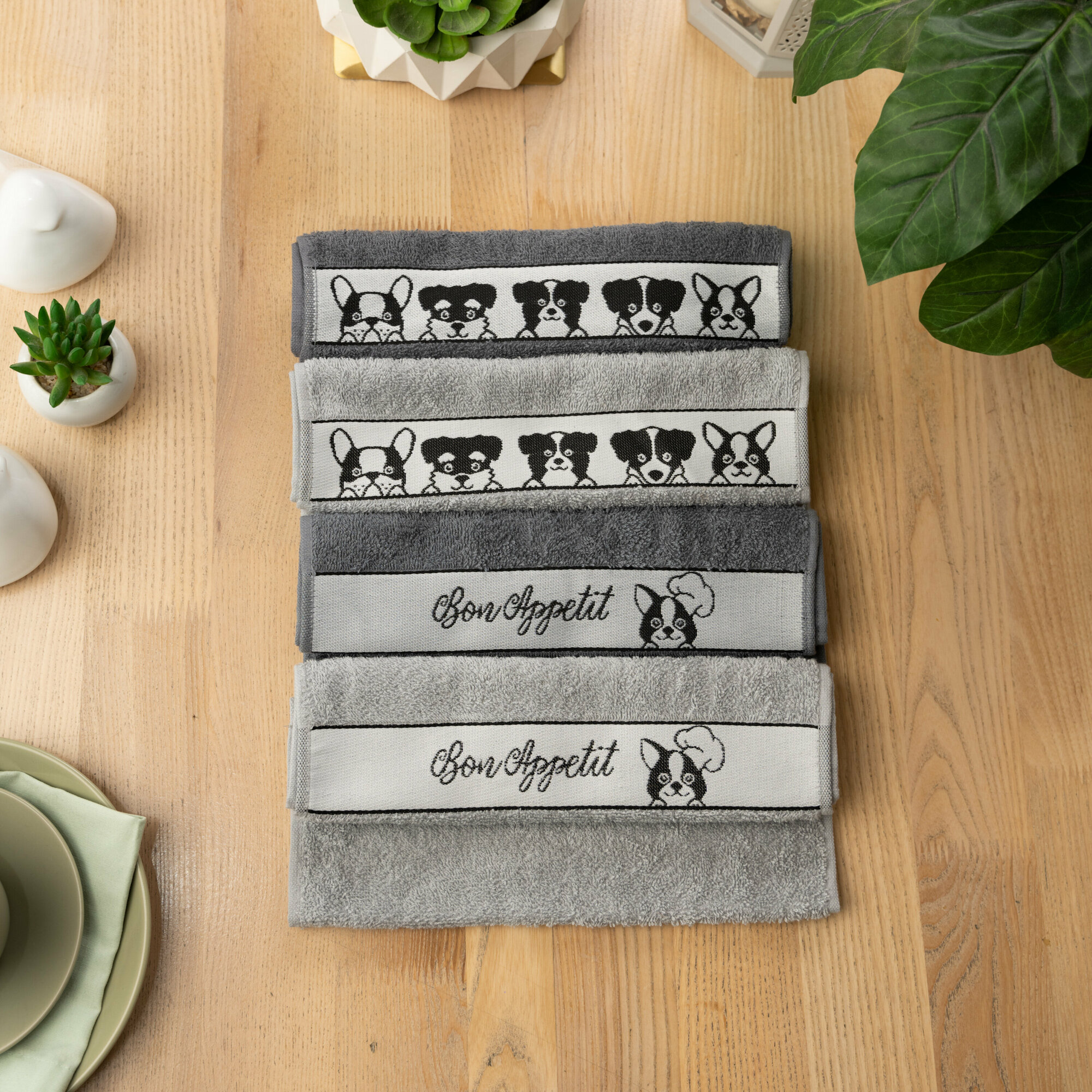 Купить Полотенца махровые кухонные 30х60 см, набор 5 шт, с петелькой, Китчен, щенки / темно-серые