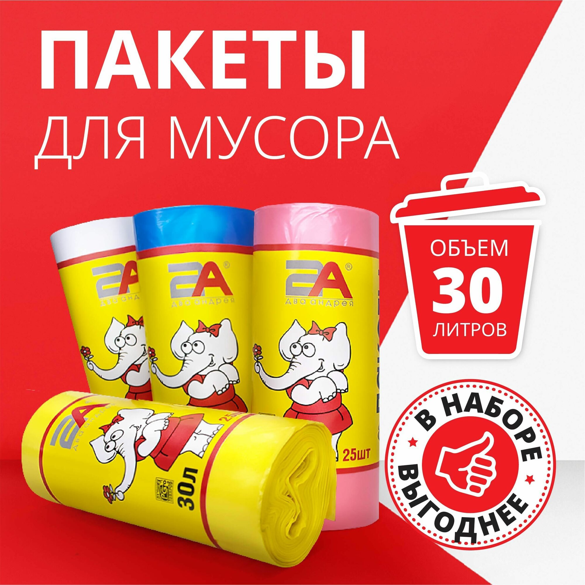 Мусорные мешки Два Андрея, сверхпрочные, 30 л, 100шт, 4 упаковки, цветные