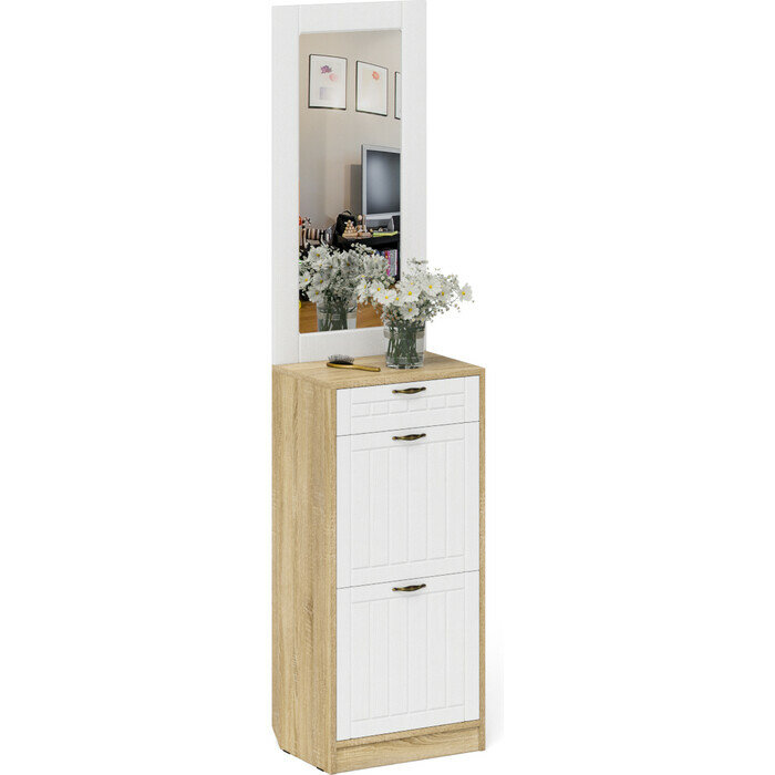 Тумба для обуви 2 секции с зеркалом П-6, цвет дуб сонома/фасады МДФ белое дерево фрезеровка прованс, ШхГхВ 50х35х210 см.