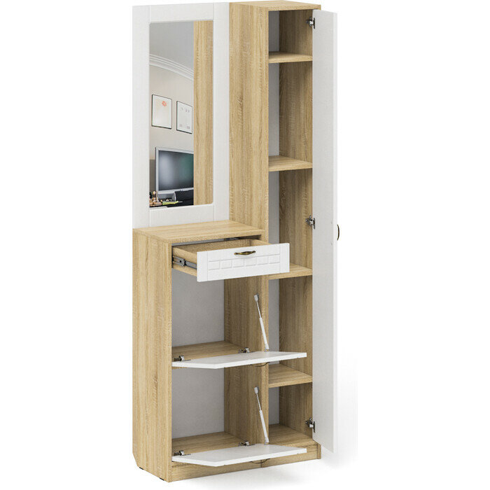 Прихожая Мебельный двор П-6 Тумба для обуви 2 секции + Зеркало, цвет дуб сонома/фасады МДФ белое дерево фрезеровка ромб (1025024)
