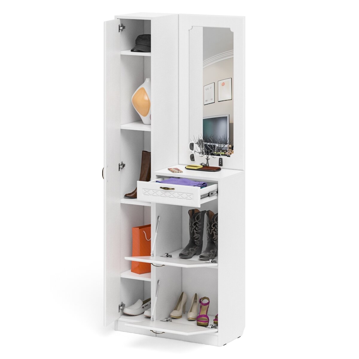 Высокая обувница с зеркалом и пеналом П-6, цвет белая шагрень/фасады МДФ белое дерево фрезеровка прованс, ШхГхВ 80х35х210 см., универсальная сборка