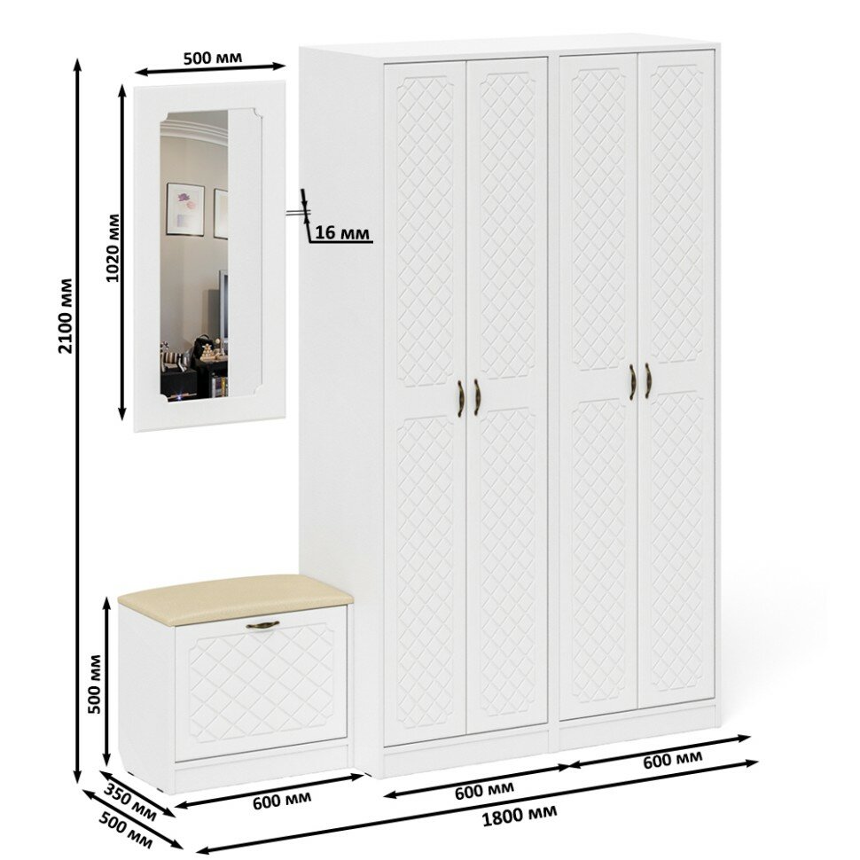 | Особенности | для маленькой прихожей, мягкое сиденье, с местом для сидения, со штангой для вешалок, шкаф с зеркалом |