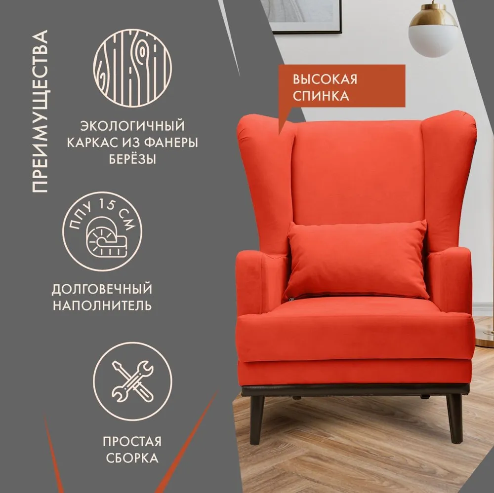 Кресло Оскар мягкое для отдыха в гостиную, на ножках, велюр оранжевый