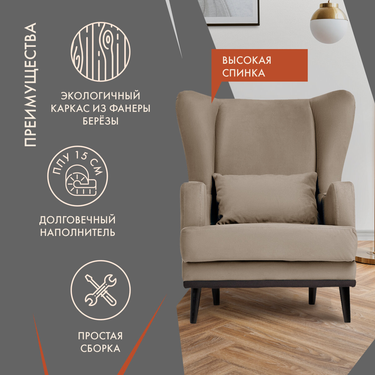Кресло Оскар мягкое для отдыха в гостиную, с подушкой, на ножках, велюр бежевый