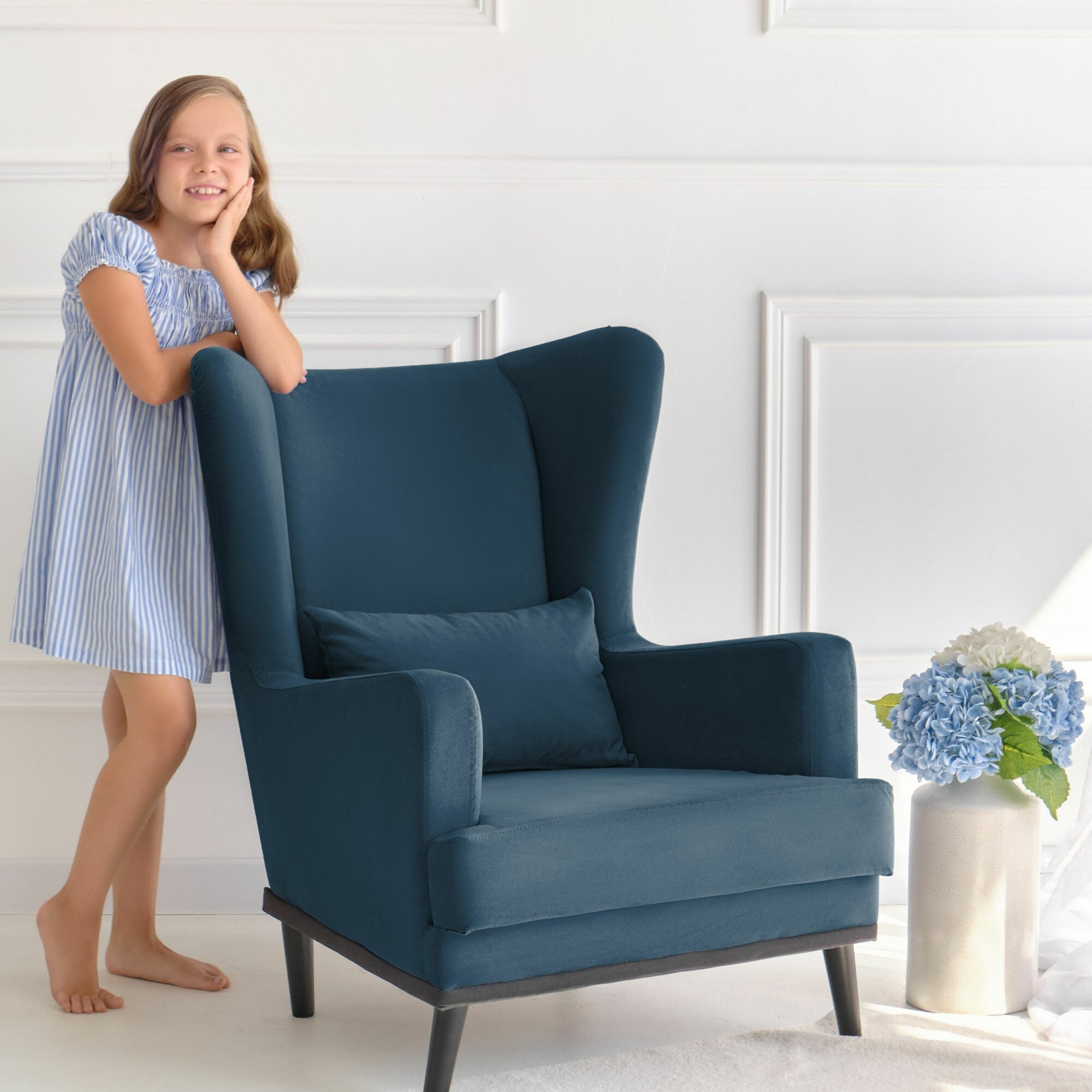 Кресло Оскар мягкое для отдыха дома, с подушкой, на ножках, велюр синий Velvet Blue 01