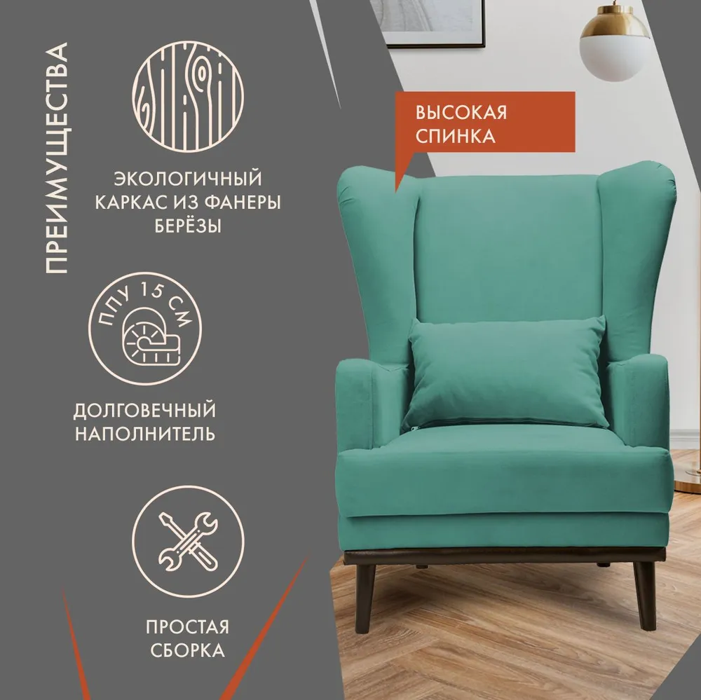 Кресло Оскар мягкое для отдыха, с подушкой, на ножках, велюр ментол Velvet Mint 03