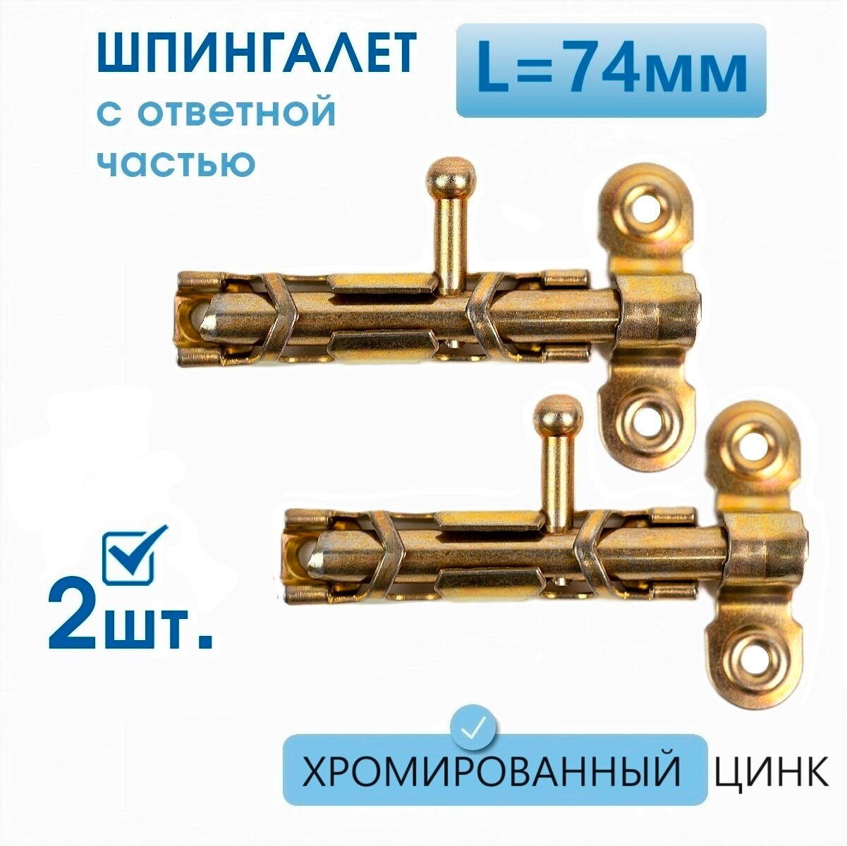 Купить Шпингалет дверной L-74 с ответной частью (2 шт), желтый цинк, задвижка накладная ЗТ, щеколда для двери