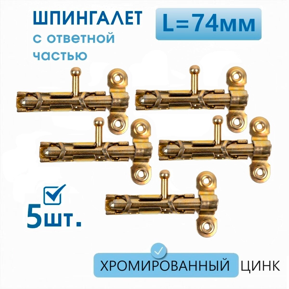 Шпингалет дверной L-74 с ответной частью (5 шт), желтый цинк, задвижка накладная ЗТ-1, щеколда для двери