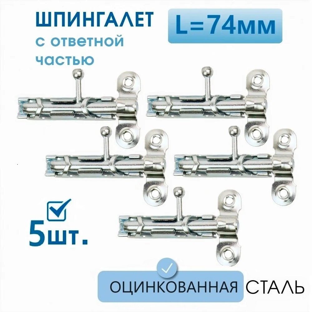Шпингалет большой L-104 с ответной частью (5 шт), оцинк. сталь, задвижка на дверь накладная ЗТ-1 с цельным движком, щеколда для двери