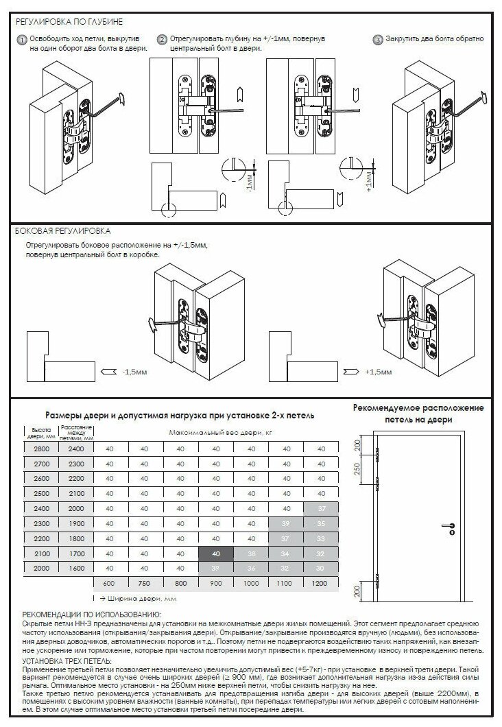 | Дополнительная информация | 3D регулировка (по гор. +/- 1,5 мм, по высоте +/- 2,5 мм, прижим +/- 1,0 мм); комплектация: петля (1 шт.) + декоративные накладки (2 шт.) + инструкция по монтажу; толщина полотна: 38 мм |