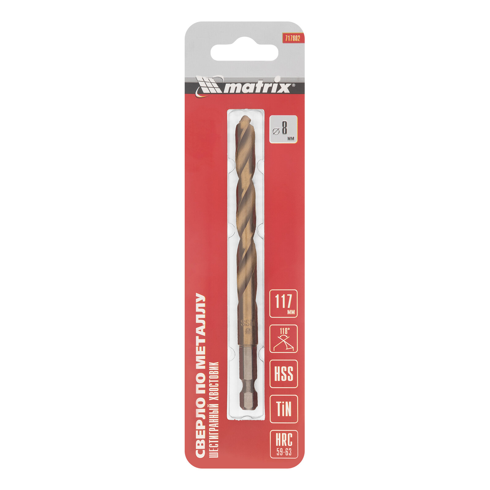 Сверло по металлу Matrix 8 мм, HSS, нитридтитановое покрытие, 6-гранный хвостовик 717802