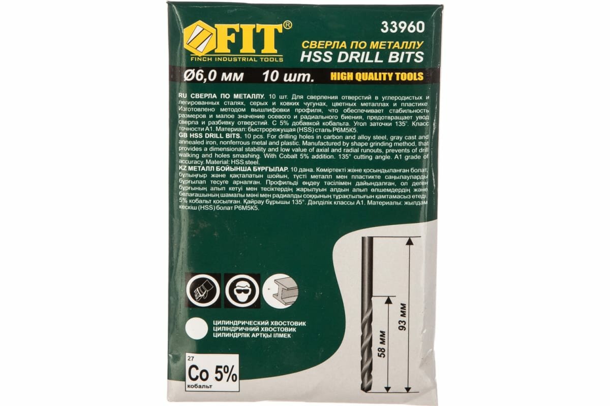 Купить Сверло 10 шт по металлу (6х93 мм, кобальт 5%, HSS, Р6М5К5) FIT Профи