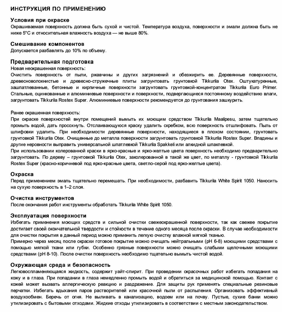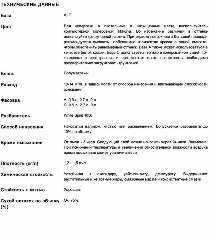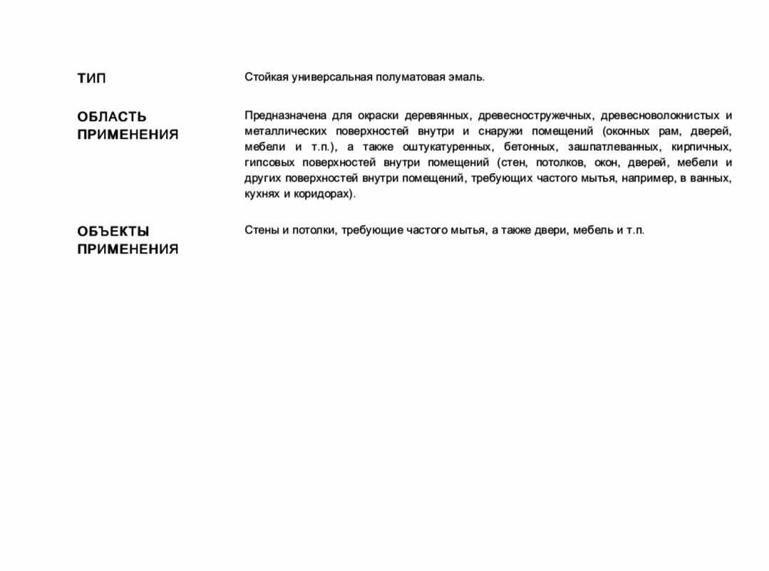 | Дополнительная информация | Стойкая универсальная эмаль. Стены и потолки, требующие частого мытья, а также двери, мебель и т.п. Предназначена для окраски деревянных, древесностружечных, древесноволокнистых и металлических поверхностей внутри и снаружи помещений (оконных рам, дверей, мебели и т.п.), а также оштукатуренных, бетонных, зашпатлеванных, кирпичных, гипсовых поверхностей внутри помещений (стен, потолков, окон, дверей, мебели и других поверхностей внутри помещений, требующих частого мытья, например, в ванных, кухнях и коридорах). |