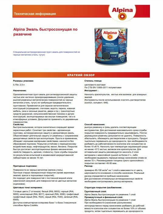 | Дополнительная информация | для антикоррозионной защиты чистых или частично прокорродировавших (после удаления рыхлой ржавчины) металлических поверхностей из черных металлов (сталь, чугун) не требующая предварительного грунтования |