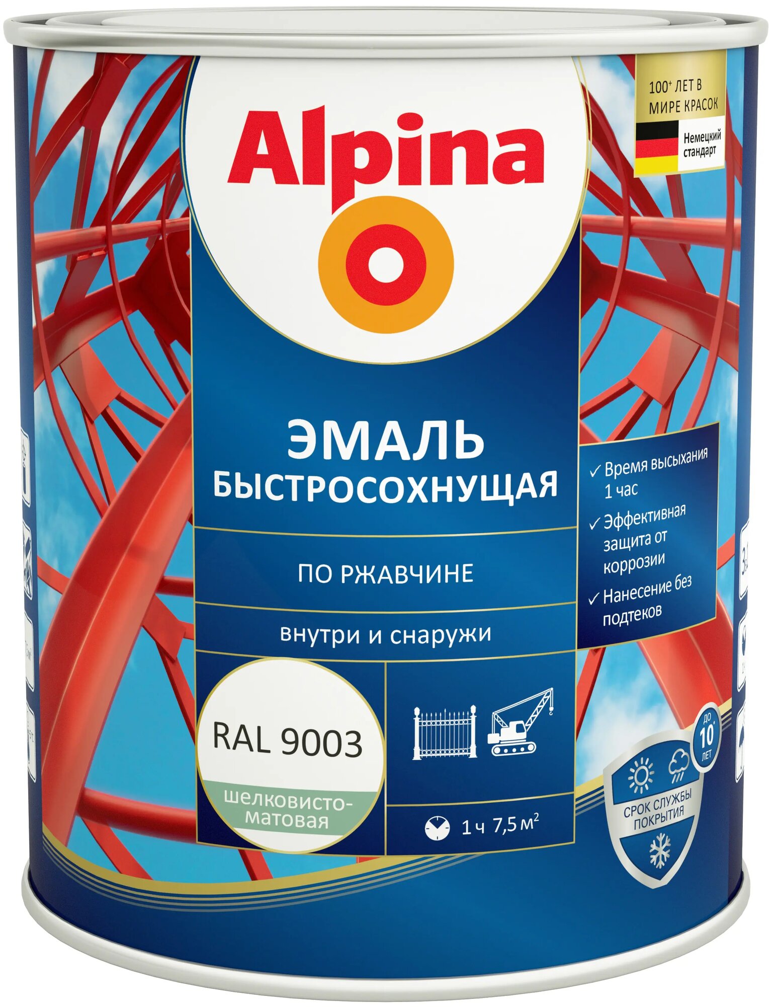 Alpina эмаль быстросохнущая по ржавчине (сигнально-белый, RAL 9003, полуматовый, 0,75л)