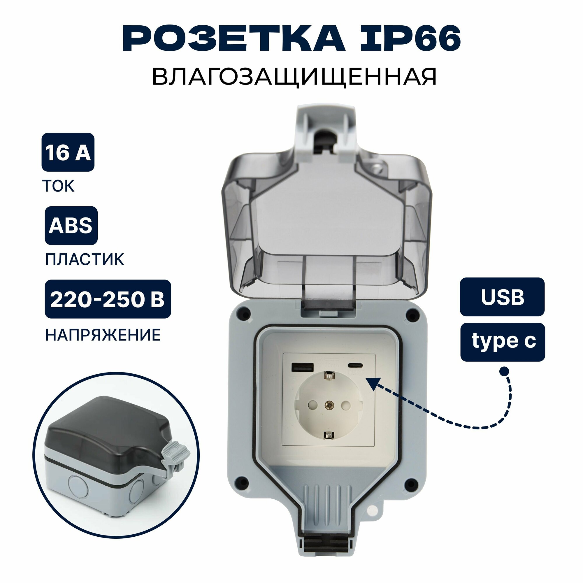 Купить Розетка уличная с USB+C IP66 влагозащищенная, садовая, наружная с крышкой, электророзетка накладная с заземлением 16А