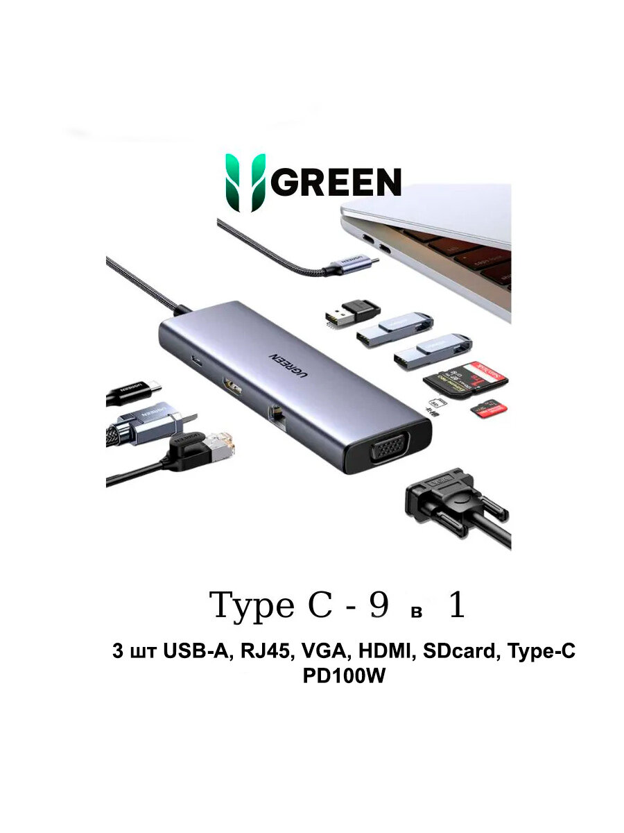 Хаб (разветвитель) Ugreen CM498, USB-C to 3*USB-A TF SD VGA RJ45 HDMI PD100W USB-C,(15600), серый интересное: