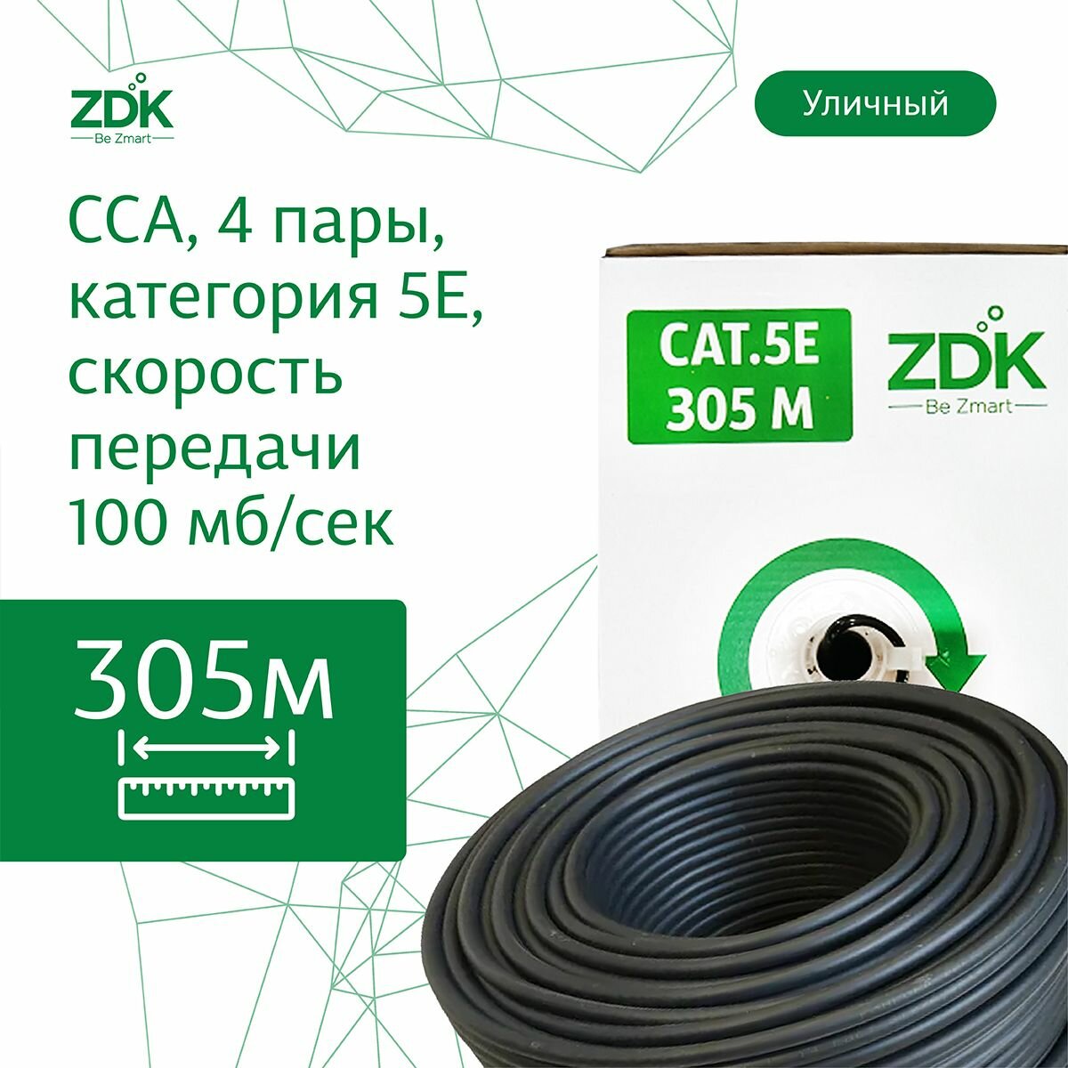 Сетевой кабель ZDK Outdoor CCA, Уличный интернет кабель, бухта 305 метров, черный, диаметр AWG, 22% меди, полиэтиленовая HDPE изоляция
