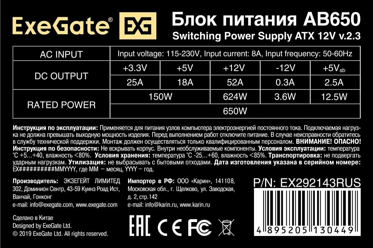 Блок питания ExeGate AB650 650W ATX Ex292143rus OEM .
