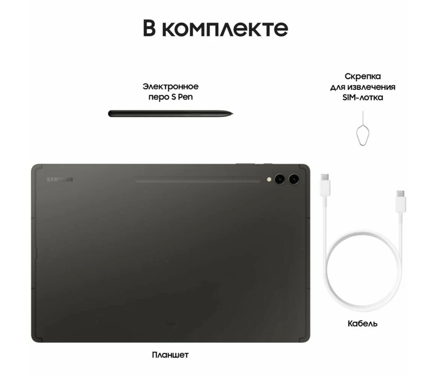 | Комплектация | Планшет, электронное перо S Pen, кабель Type-C (m) - Type-C (m), скрепка для извлечения SIM-лотка |