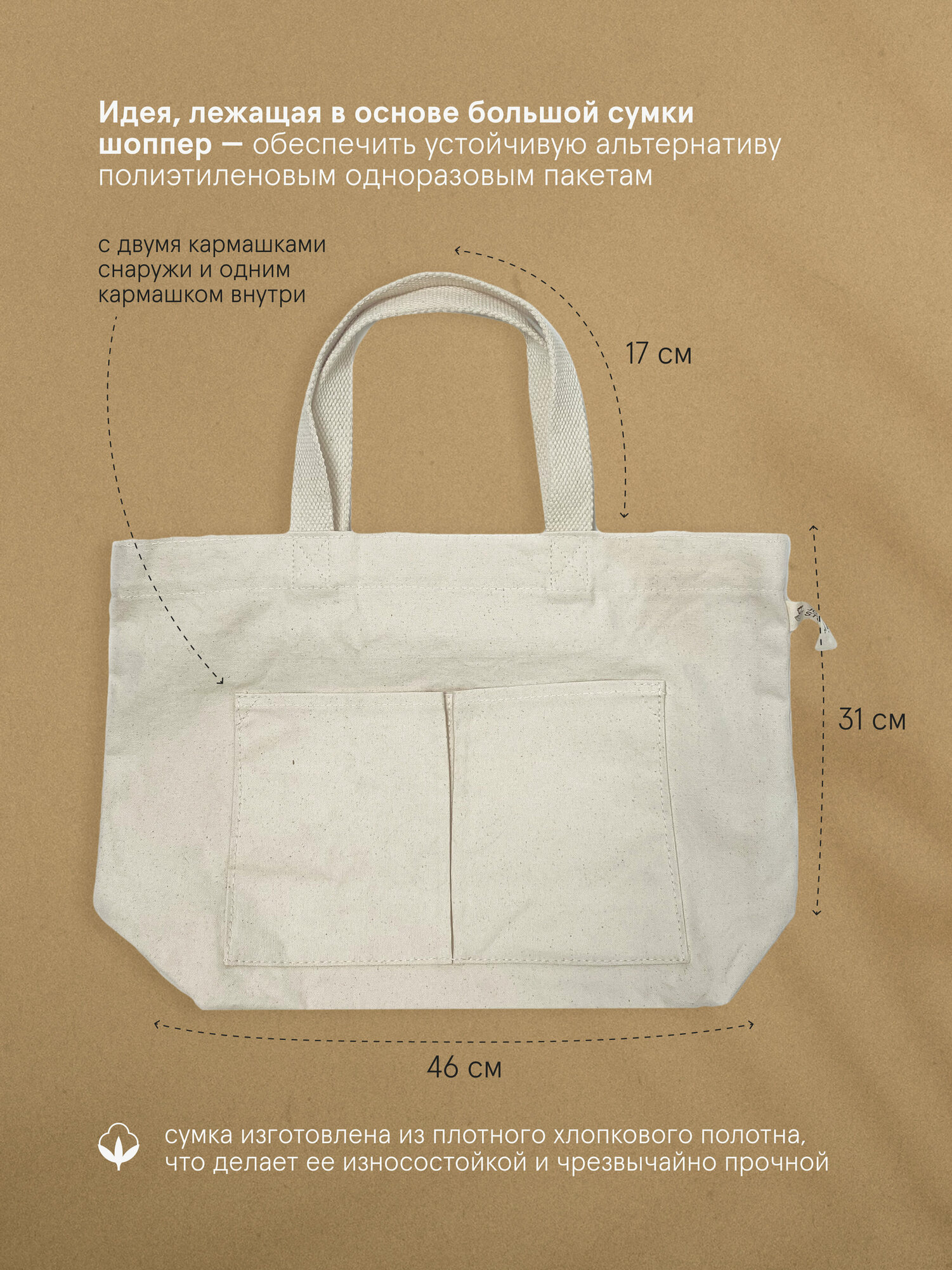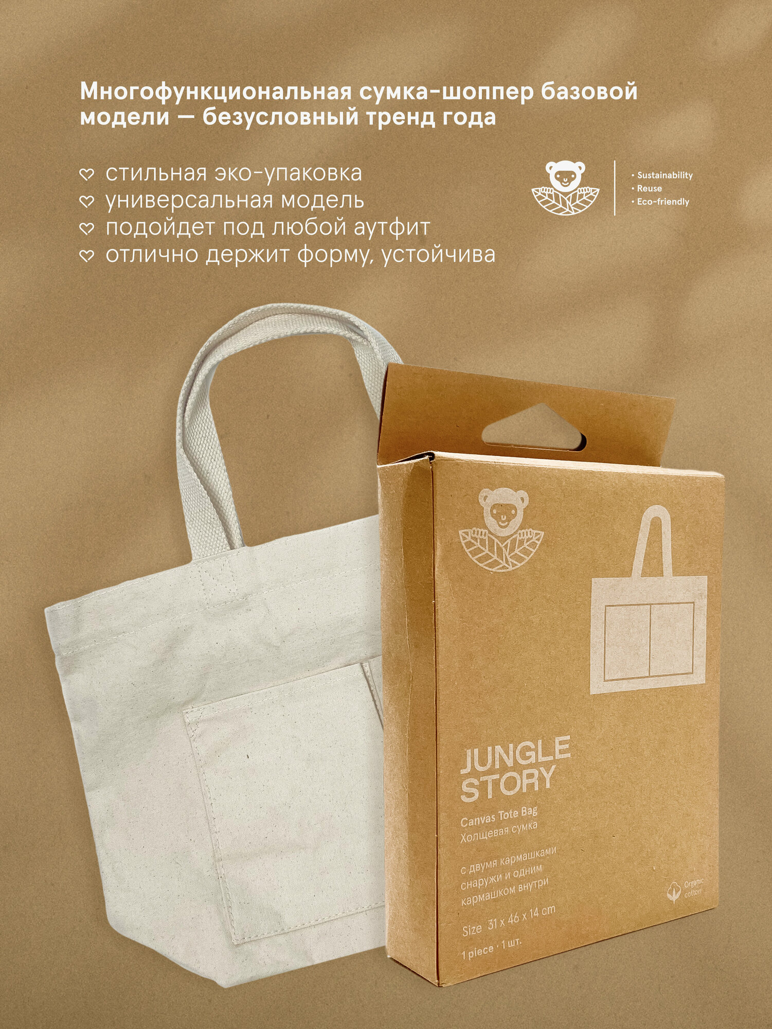 Холщовая сумка Jungle Story с двумя внешними карманами и одним внутренним интересное: