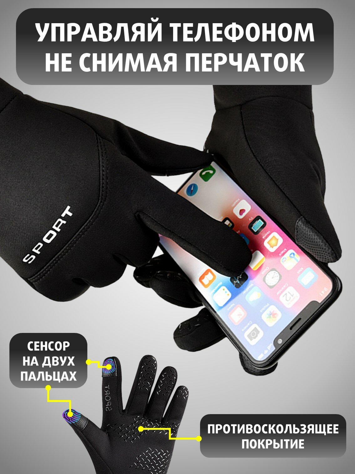 Зимние мужские перчатки с сенсорным пальцем / Утепленные непромокаемые перчатки на флисе для мужчин, парней и подростков / термо-перчатки цвет черный
