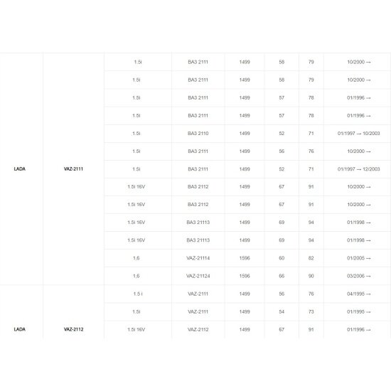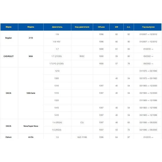 | Модель автомобиля | Chevrolet Lanos / Chevrolet Niva / Datsun mi-DO / LADA 2105 / LADA 2108 / LADA 2110 Богдан / LADA Granta / LADA Kalina / LADA Largus / LADA Priora / LADA Vesta / LADA X-RAY |
