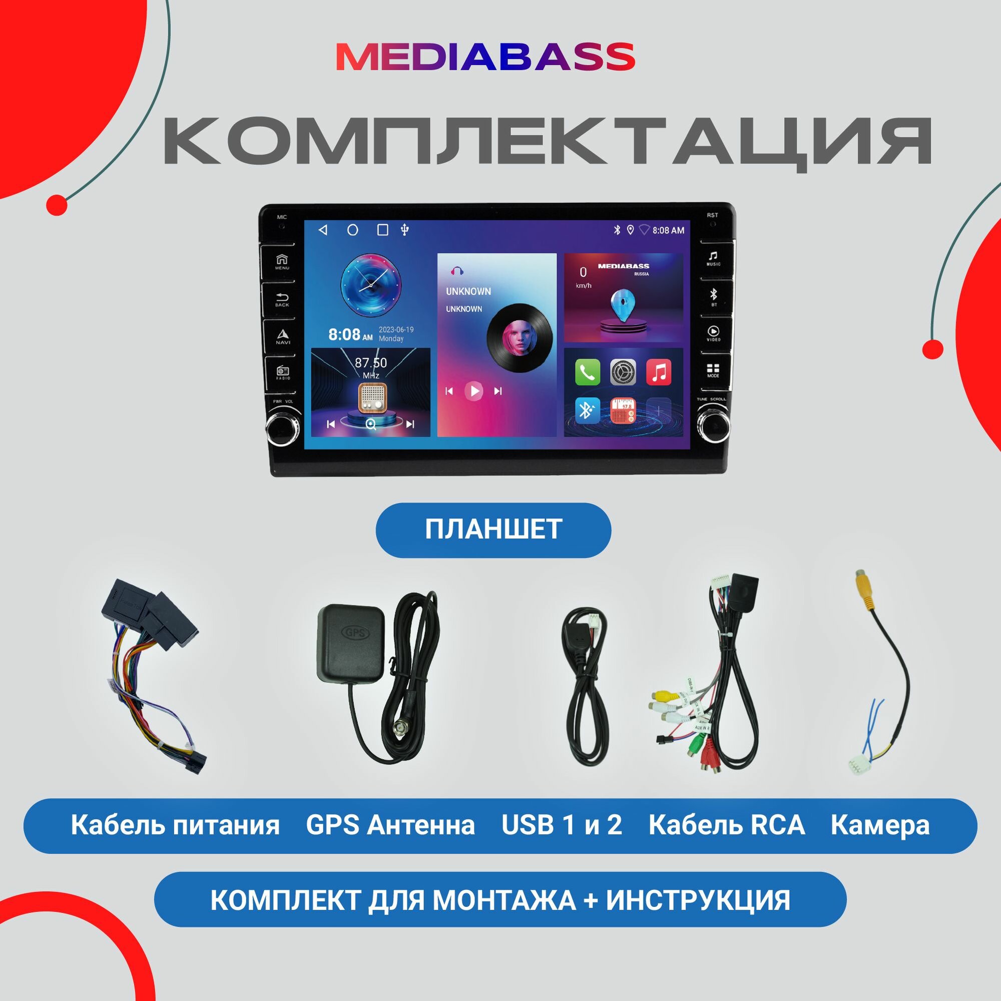 | Подробная комплектация | 1. Головное устройство 2. Переходная рамка 3. Комплект проводов для подключения 4. GPS антенна 5. 4G антенна 6. Камера заднего вида |