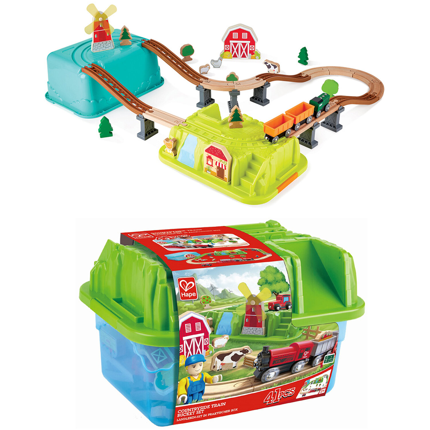 Купить Детская деревянная железная дорога в чемодане Hape "Фермерский дворик" с контейнером для хранения E3783_HP